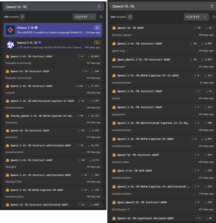 検索するとQwen2-VL-7bは、数が多い(GGUFのどれが良いかとGemini聞く候補は2つ)